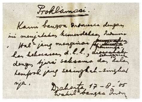 Terdapat tiga versi naskah teks proklamasi kemerdekaan indonesia 17 agustus 1945, yaitu teks proklamasi pada naskah klad; Sehari sebelumnya, tanggal 16 agustus 1945, sayuti melik dan para pemuda revolusioner lainnya mengamankan sukarno dan mohammad hatta ke rengasdengklok, dekat. Soekarno yang didampingi oleh drs. Esok harinya, tepat pada pukul 10.00 wib hari jumat, 17 agustus 1945 yang bertepatan juga pada 17 ramadan 1365 hijriah, teks proklamasi kemerdekaan indonesia dibacakan di pegangsaan timur, jakarta. Para aktivis dan pejuang kemerdekaan berkumpul.